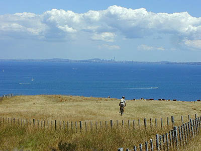 こちらはオークランドの北にある、シェークスピア・パークのコース。 パークといっても、丘一面の牧場で、その中にシングルトラックのコース有り。ここはハイキングコースと併用なのですが、平日ならこの通り、いるのは牛と羊のみ。 ……ということで、路面は糞だらけにつき、転倒注意。 (2001/03/07)