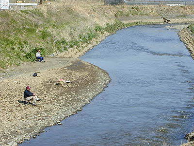 ![]() わずかなに残った土手では釣り人が。 残ったというより、くずれた土手って感じか。 |