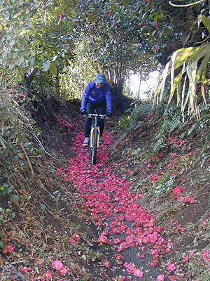これは昨年の写真。椿の廊下をバイクで走り抜けます。 場所は、湘南国際村Cコースの途中です。