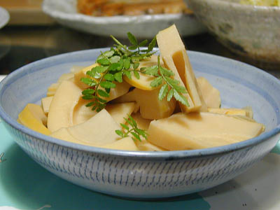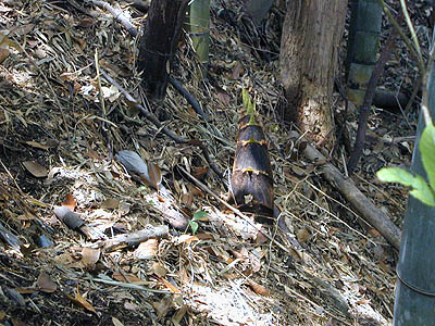 で、我が家では花よりダンゴでありまして、この季節は竹の子ですね。 場所は秘密。ま、やたらに掘ると地主にぶっとばされるのでご注意を。とはいえ、やたらに茂っておりまして、放っておくと辺りかまわず浸食していくので、気が付いたら掘った方がいいのですよ。 写真の位だと大きすぎ。頭がちょこっと出ているくらいを掘り進むのがいいんだそうな。スタコラ歩いていると踏みつぶします。